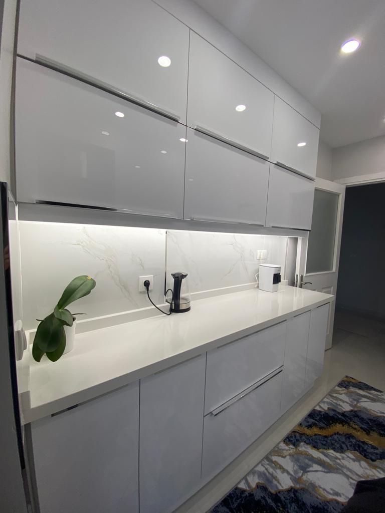 Görünen dolap yanı kısımlarına da kapak malzememizden dönerek o kısmı da akrilikle çeviriyoruz.